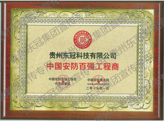 通过评选,贵州东冠科技有限公司荣获2016年度“中国安防百强企业工程商”称号。获得荣誉的同时我们也将继续努力,以一流的质量、优质的服务和高效的施工,更好地为客户服务,为中国安防行业的发展贡献自己的力量。